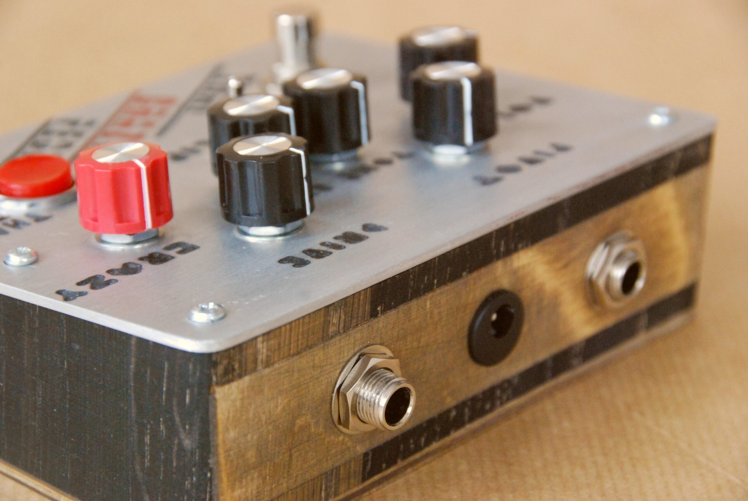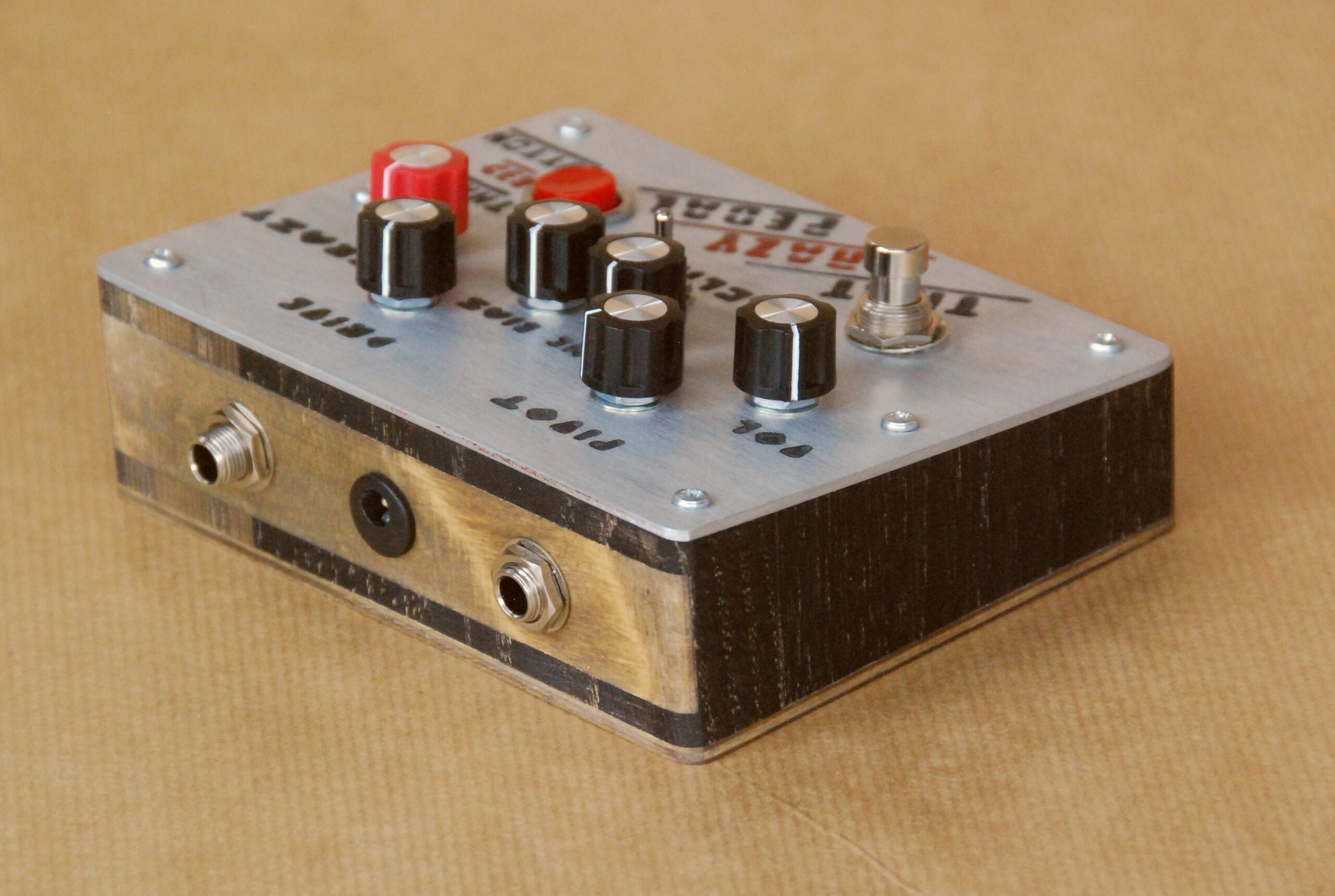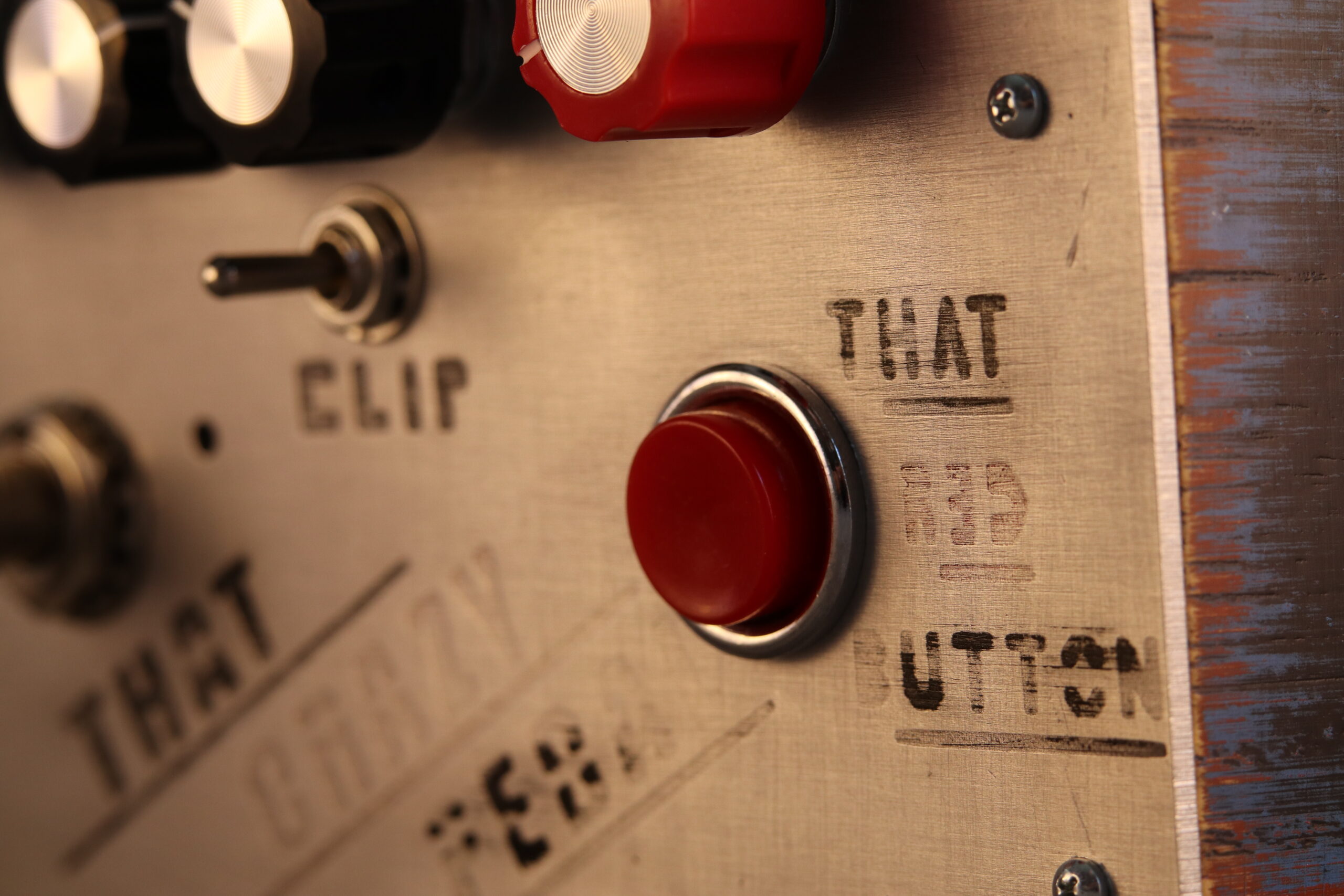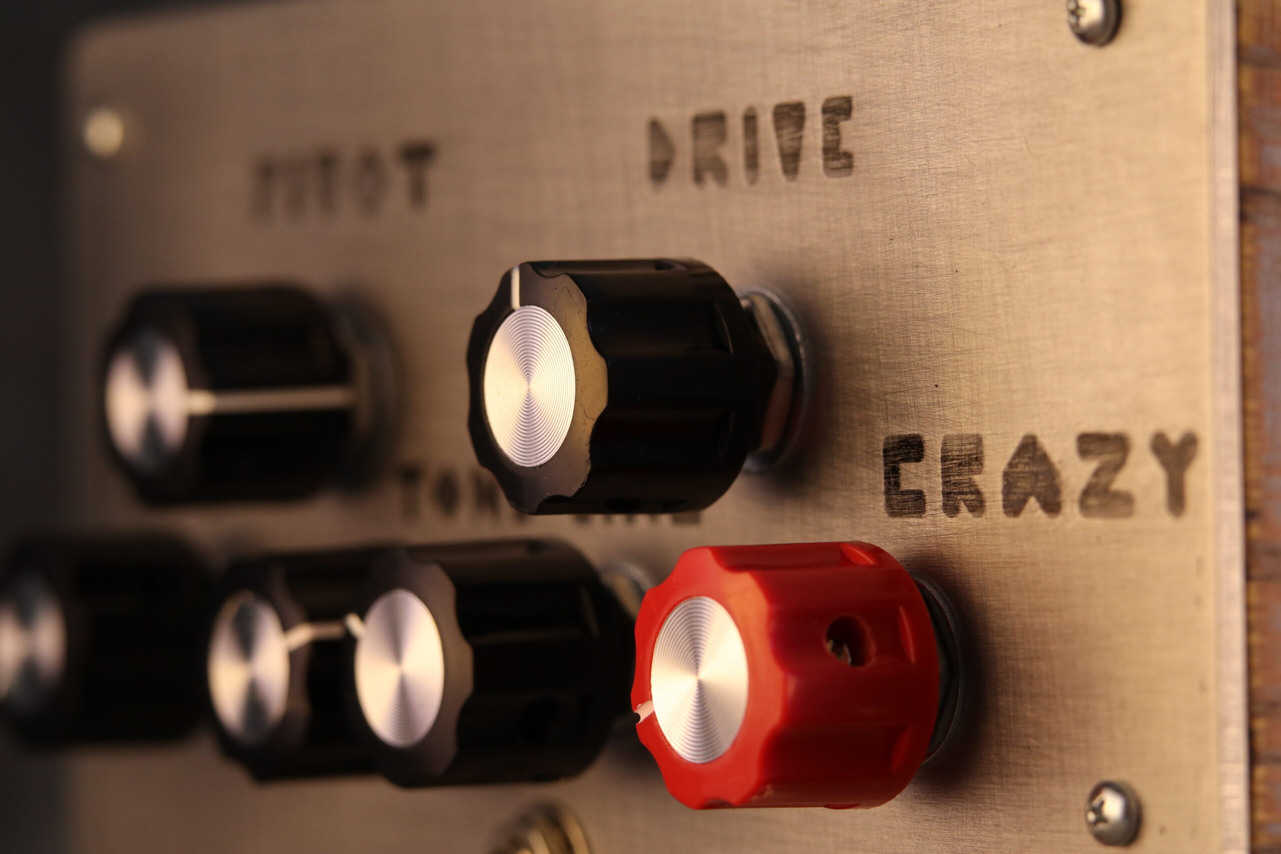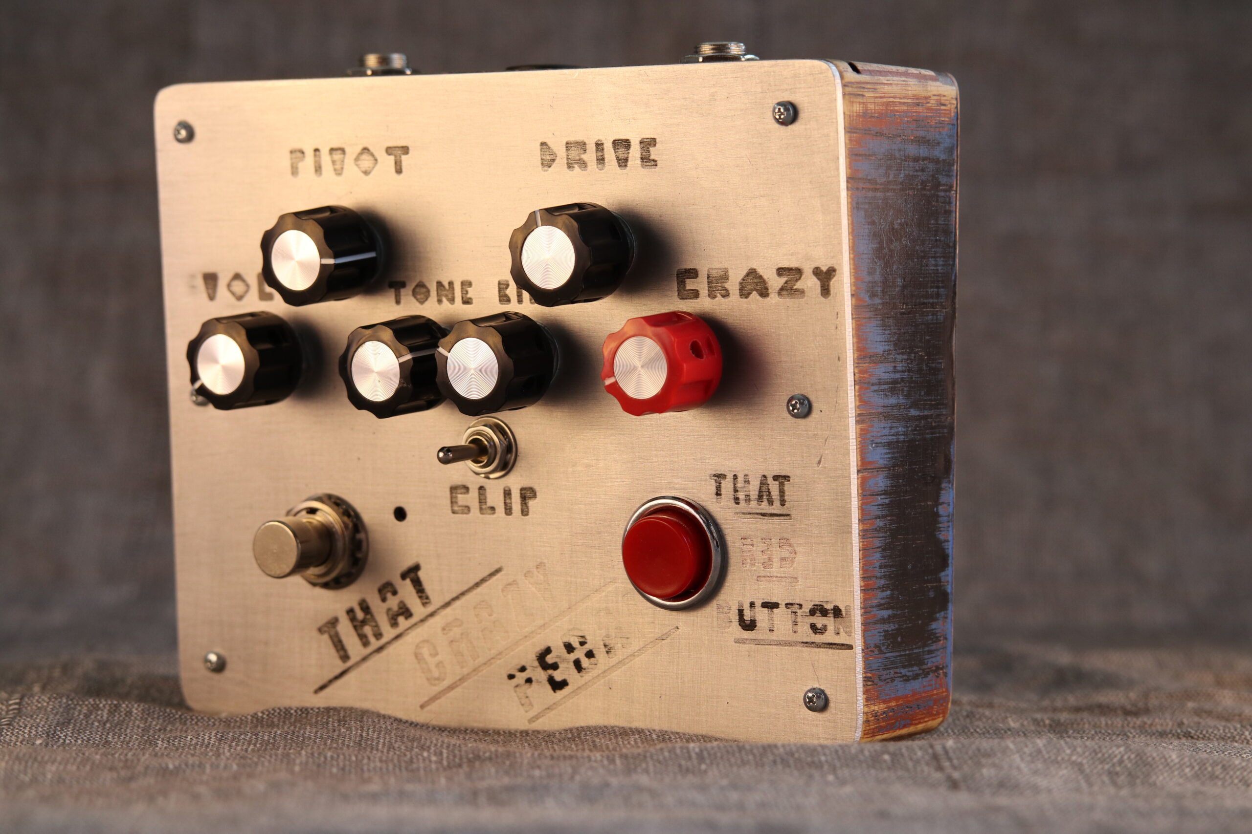 What’s under the hood? A high gain, modern silicon transistor stage pushing two vintage, NOS germanium transistor stages. The pedal has a great spectrum of overdrive and fuzz tones. Its most outstanding feature is the big, red, momentary button. Depending on the position of the “crazy” knob and other settings, it will either boost your tone, sustain it, or sustain it and start feedbacking after a couple of seconds – irrespectively of your amp’s volume! But crank it up, let the natural feedback kick in on top of the artificial one, and listen in awe to what happens when you strike a note. What goes on when you press the red button depends a lot on other settings. Let’s go through them.
